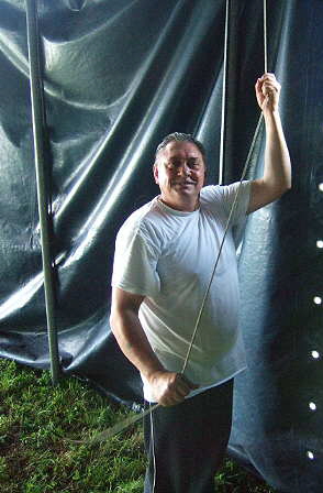 Das Chapiteau wird eingerollt und auf den Chapiteauwagen herabgelassen