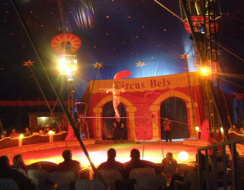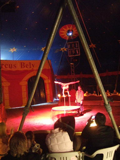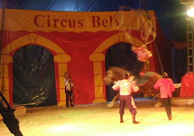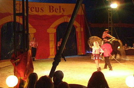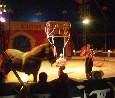 Treu der Familientradition, in der früher die Frankordi-Reiterei bei Barum, Krone und vielen anderen Grosscircussen mit dem Sprung mit dem Sulky auf den Armen überzeugten, zeigt dies zum Programmende Stefan`s Sohn im Familiencircus Bely.